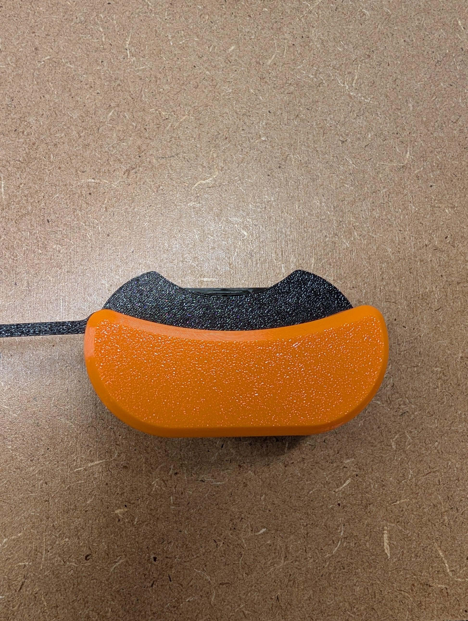 Imprimé en 3D. La poignée est en plastique dur, le fond et la lanière sont en plastique souple ressemblant à du caoutchouc.