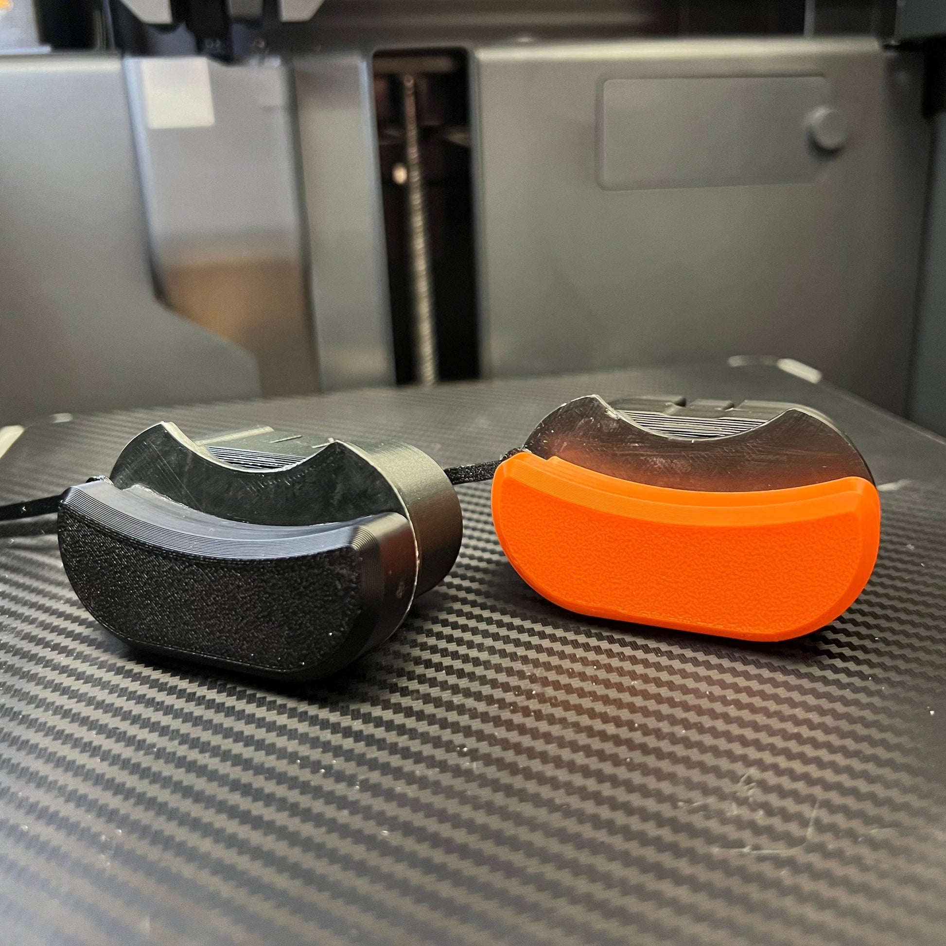 3D printed. the handle is made from hard plastic, the bottom and tether are made from flexible rubber-like plastic.